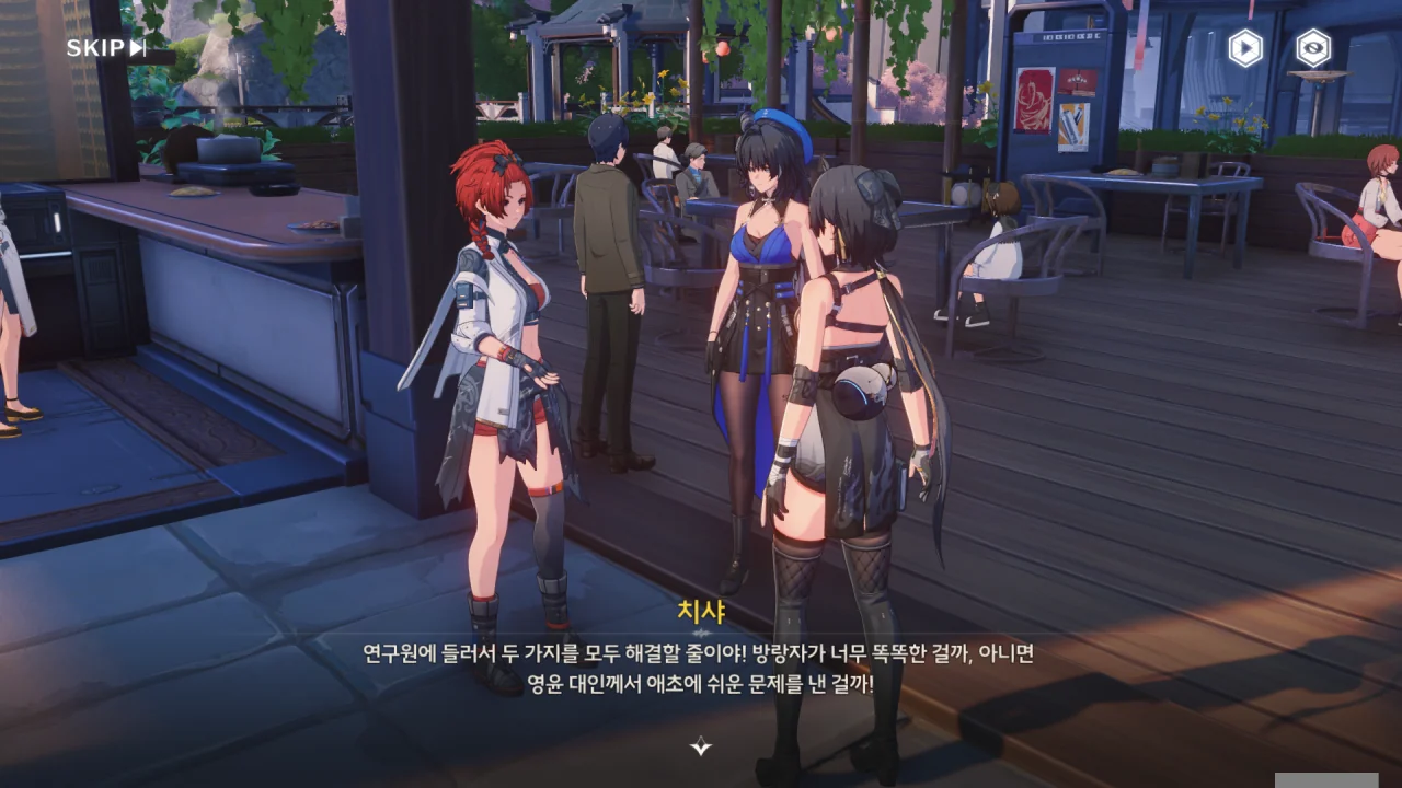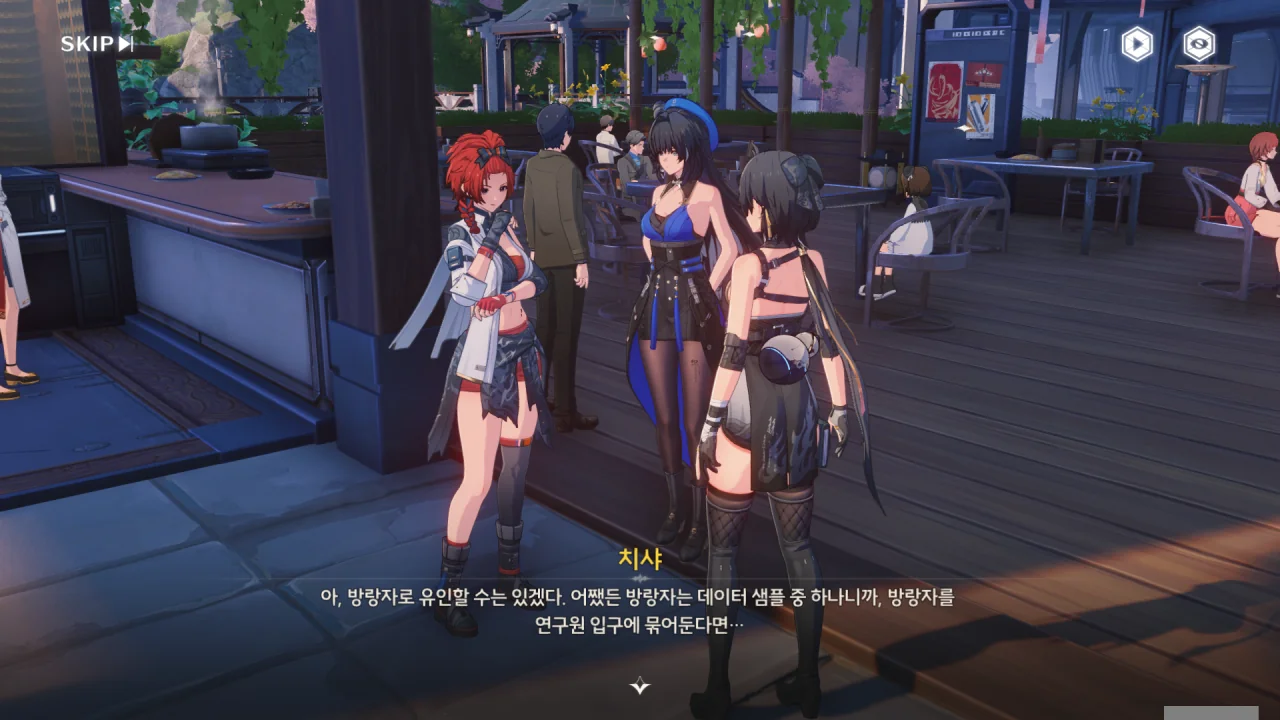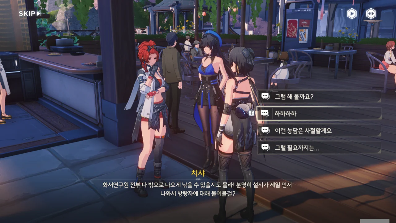 치샤가 방랑자를 연구원 입구에 묶어두면 연구원 사람들을 전부 밖으로 끌어낼 수 있지 않겠냐는 농담을 한다.