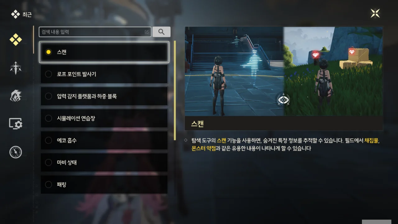 원신의 '원소 시야'와 비슷한 기능이지만, 쿨타임이 없는 원소 시야와 달리, 스캔에는 쿨타임이 있다. 그 대신 몬스터의 약점 같은, 더 많은 정보를 보여주지만.