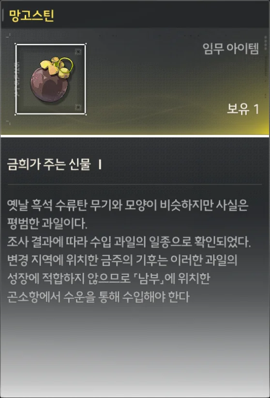 변경 지역에 위치한 금주의 기후는 이러한 과일의 성장에 적합하지 않으므로 「남부」에 위치한 곤소항에서 수운을 통해 수입해야 한다.