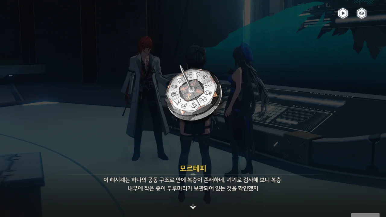 모르테피가 누락된 부품을 해시계에 장착했다. 정확한 방위 정보와 시간을 바늘 버클의 방향에 맞추면 기관함이 열릴 거라고 한다.