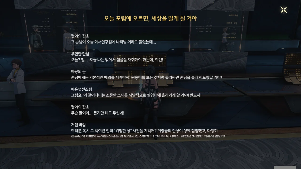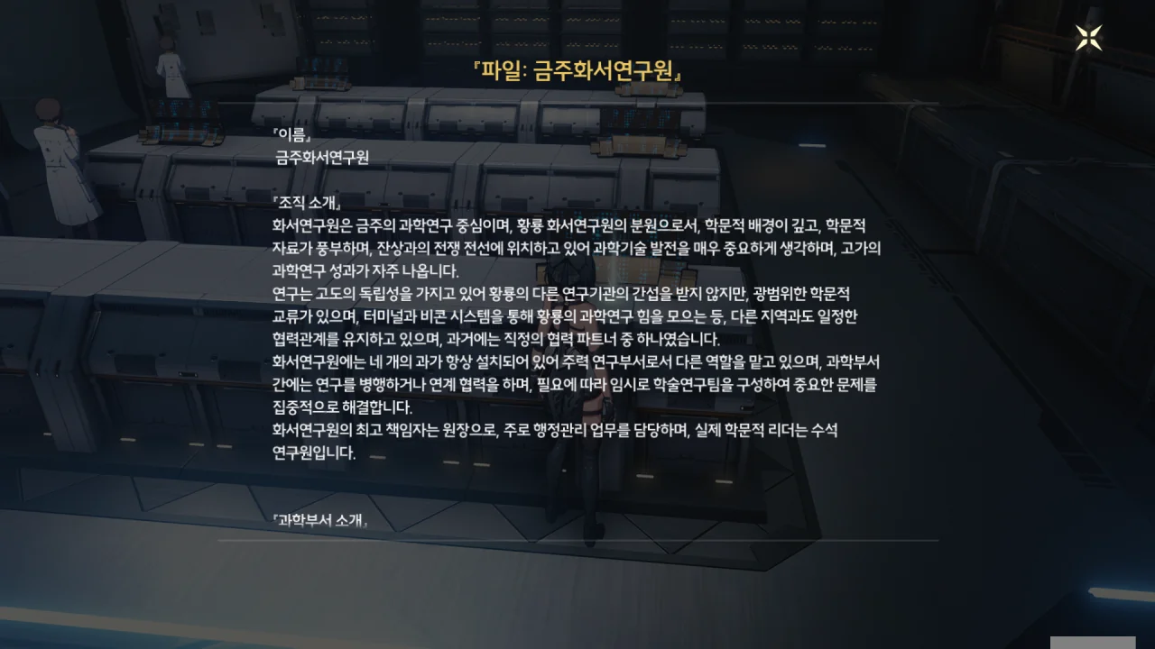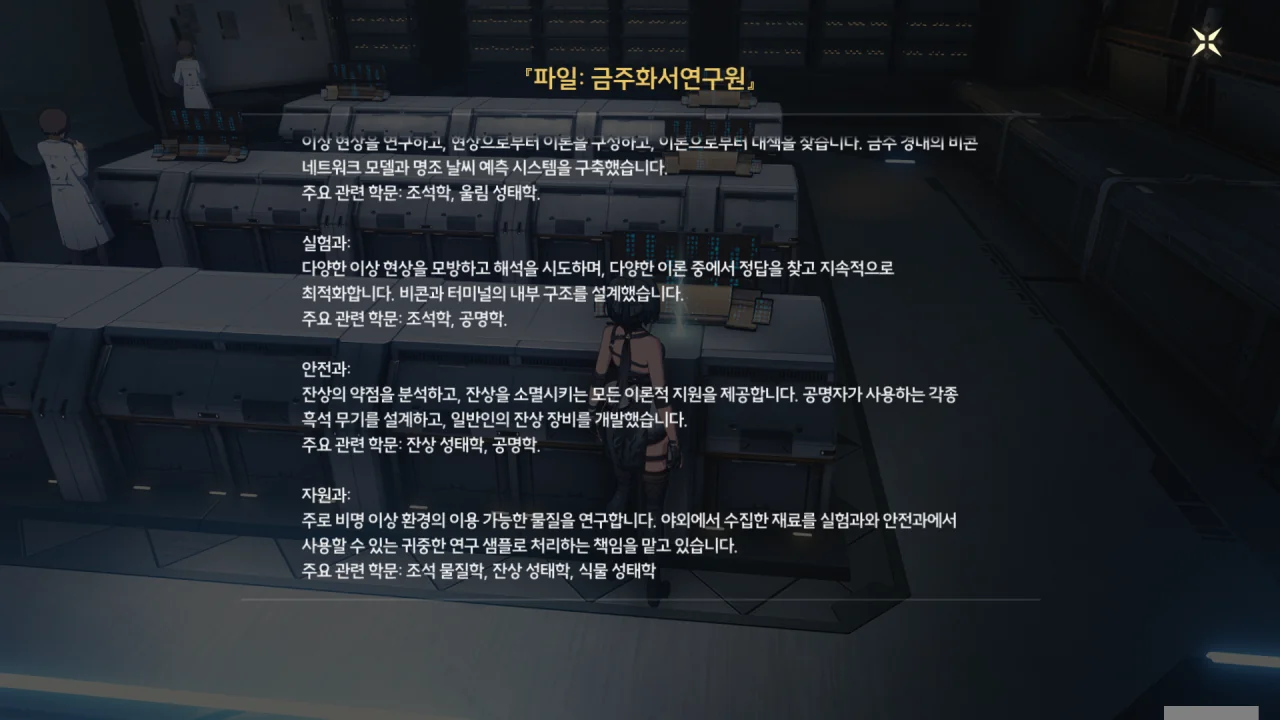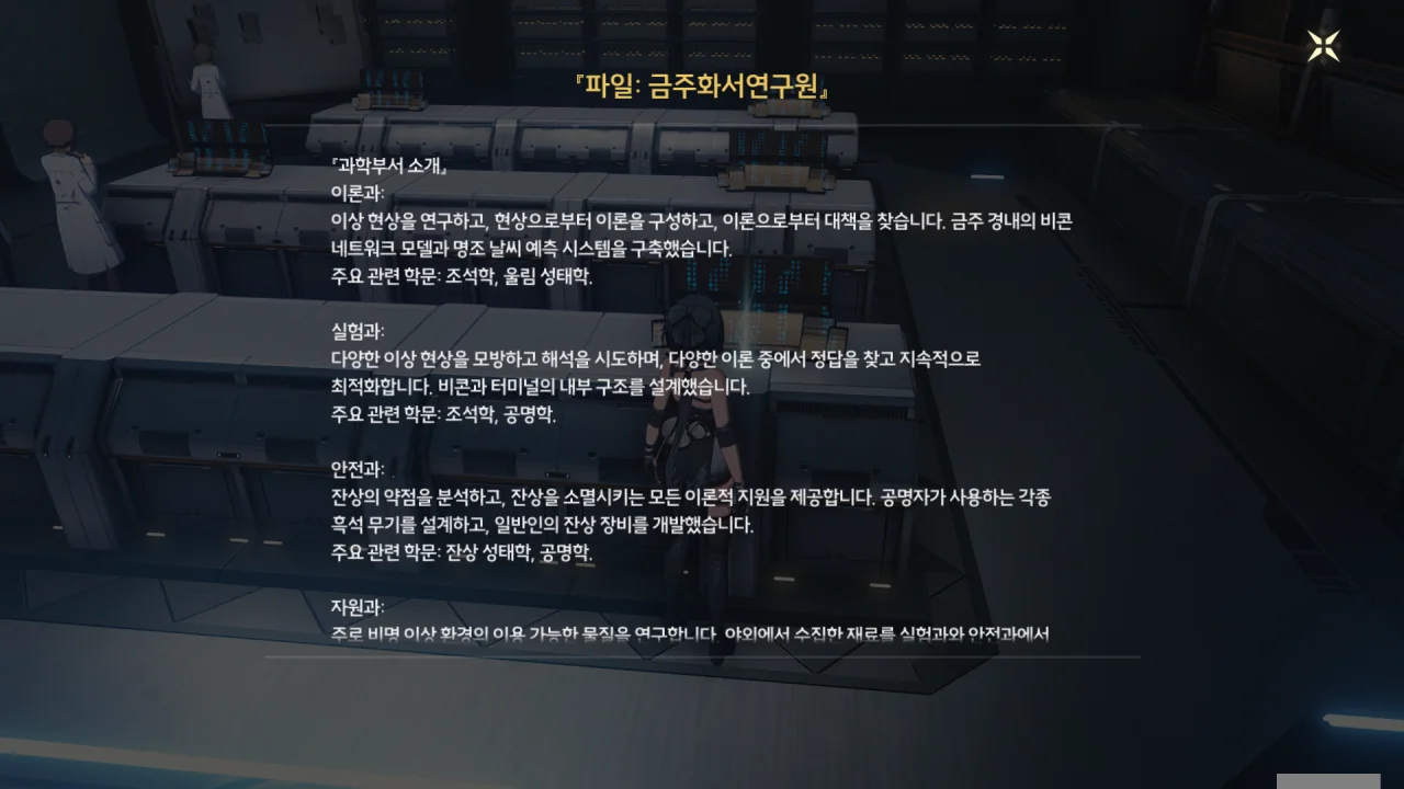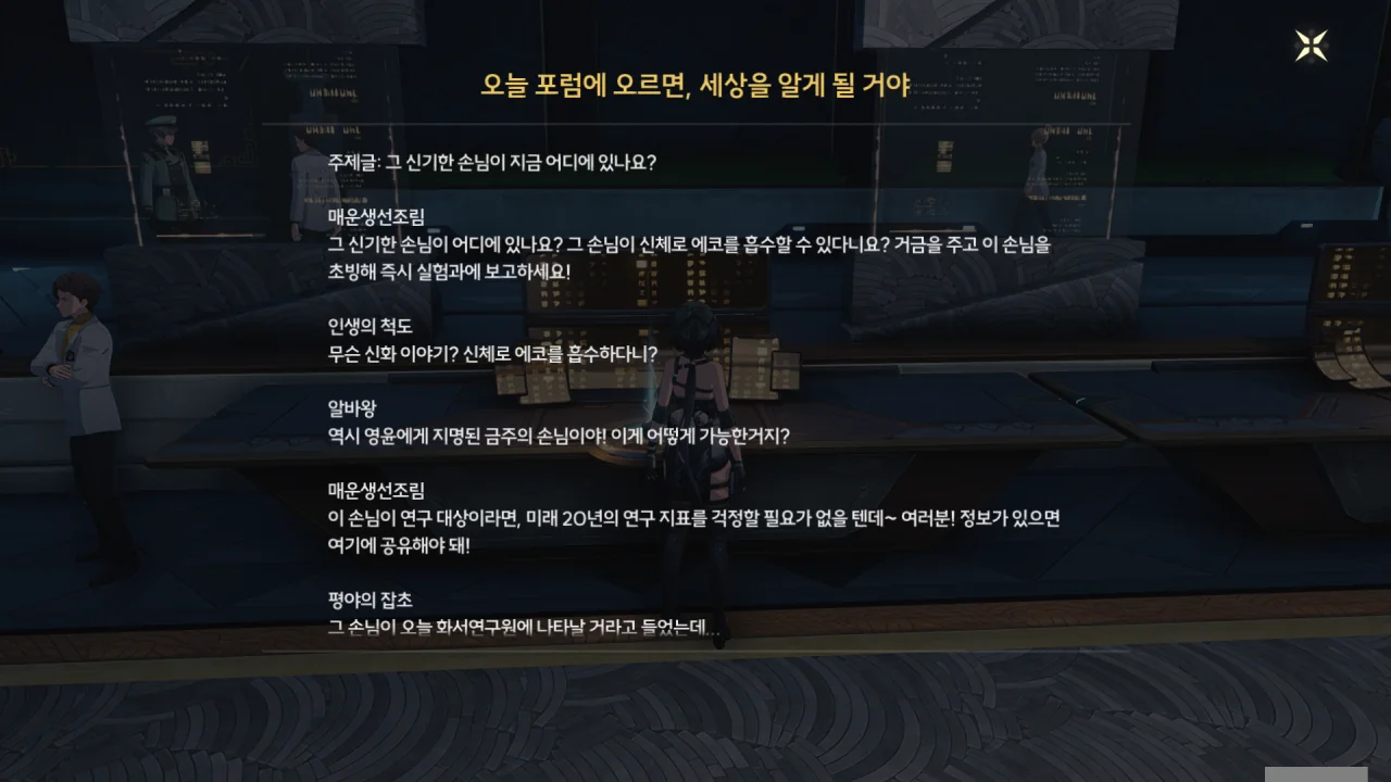 방랑자가 신체로 에코를 흡수했다는 사실, 금희에게 지목된 금주의 손님이란 사실, 오늘 화서연구원에 올 거란 사실 등이 연구원에 널리 퍼져있다. 보통 그런 건 기밀로 처리하지 않아…?