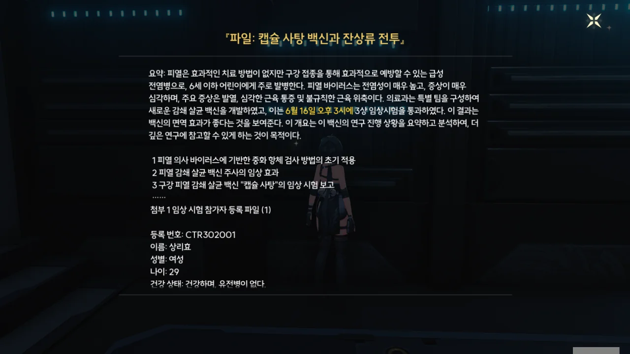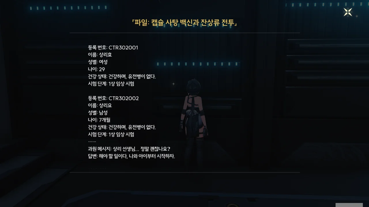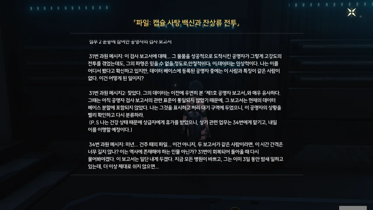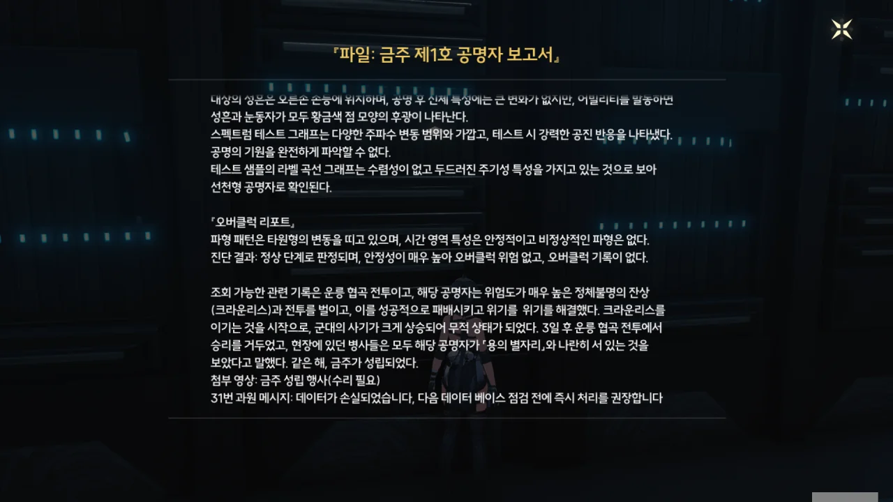 고강도의 전투를 겪었음에도 안정적인 파형을 유지한 그 공명자의 데이터는 「제1호 공명자 보고서」에 적힌 데이터와 매우 유사했다. 하지만 그 공명자와 제1호 공명자의 시간 간격은 상당히 길었던 모양이다. 정황상 제1호 공명자가 등장한 건 '미년 건주'라고 하는데, 여기서도 '미'가 나온다.