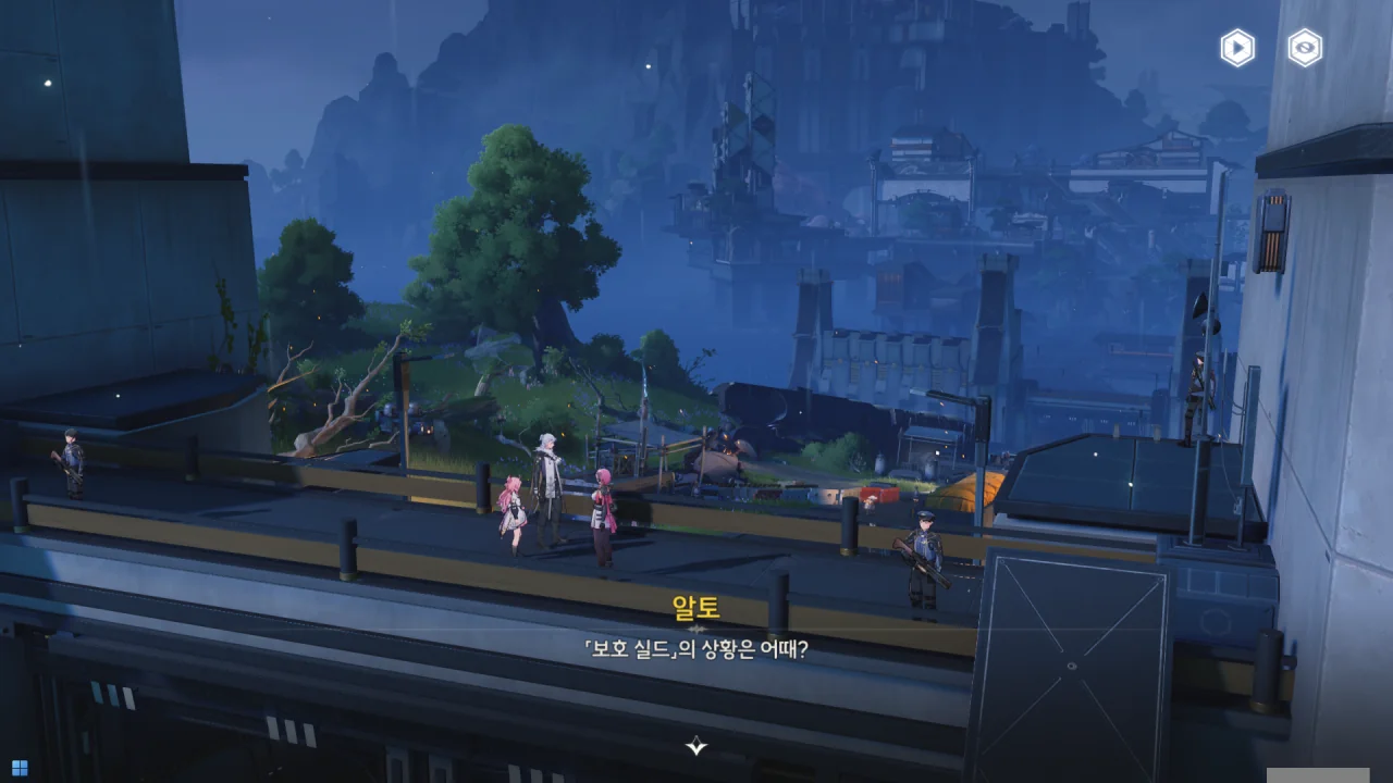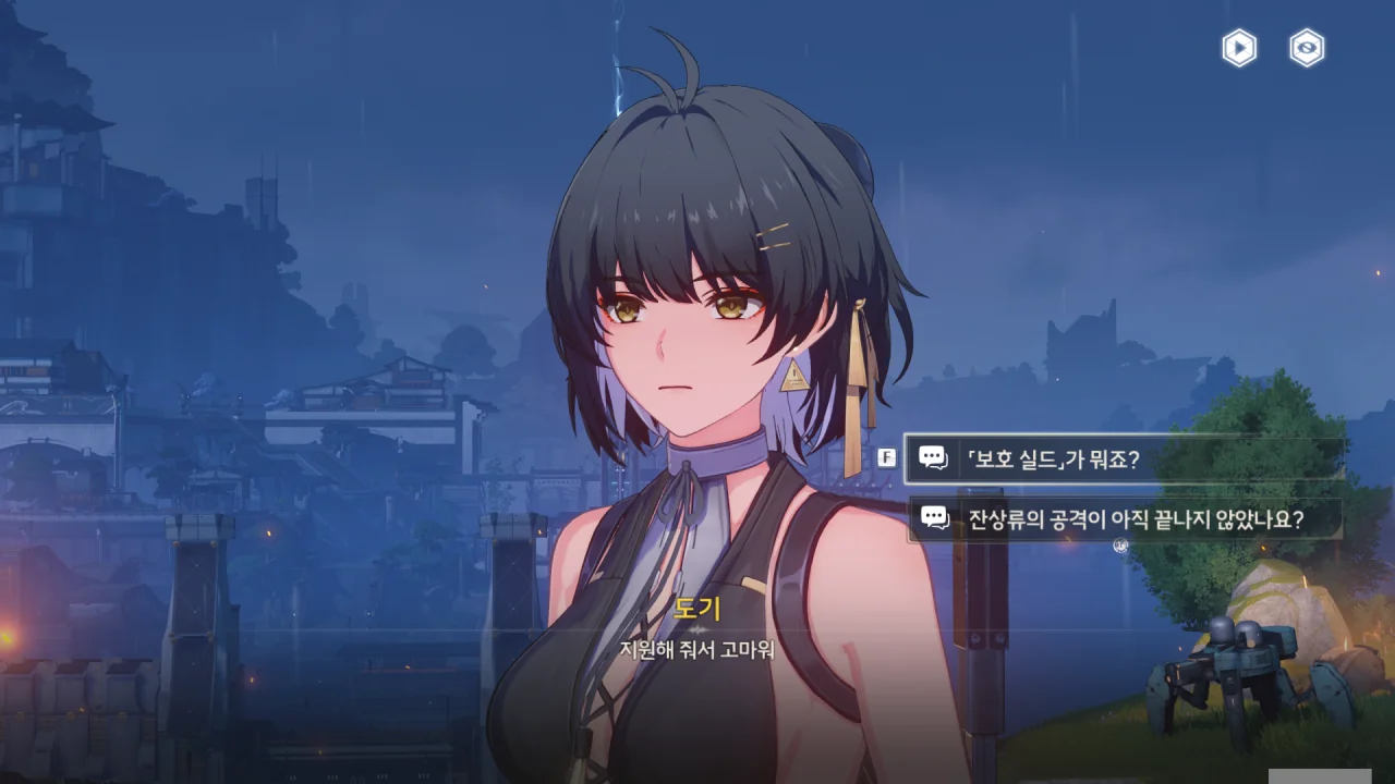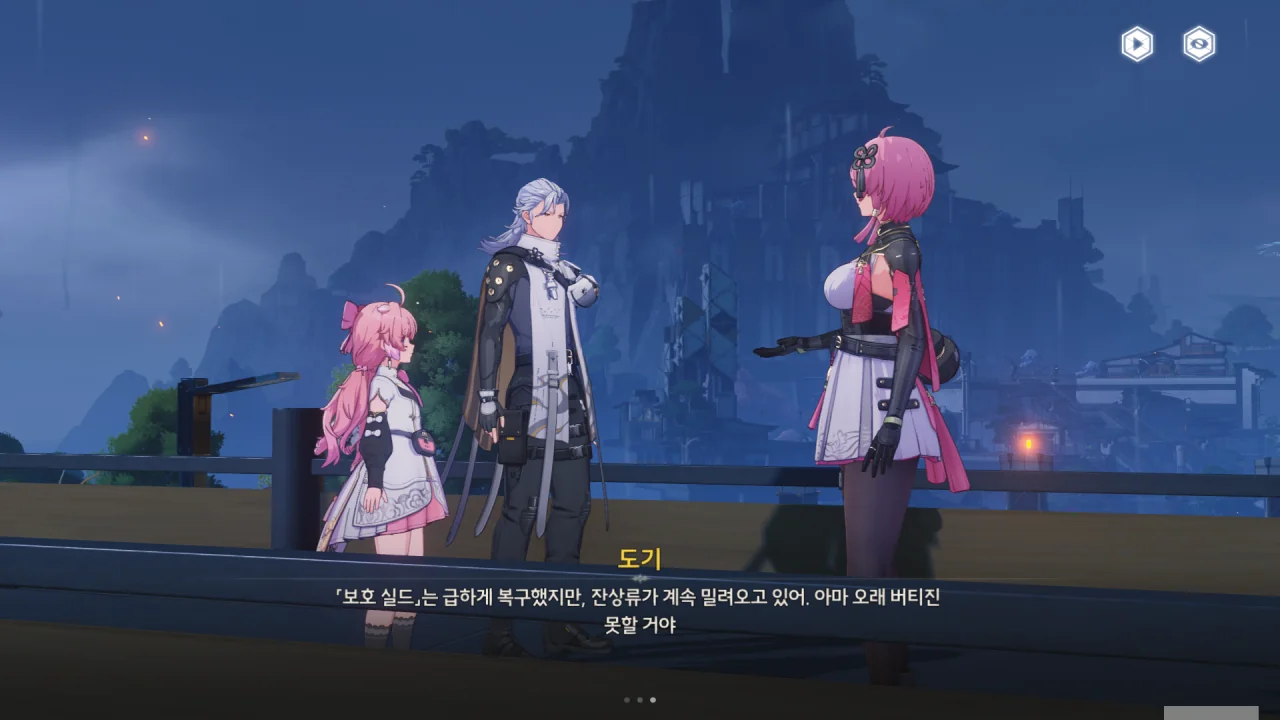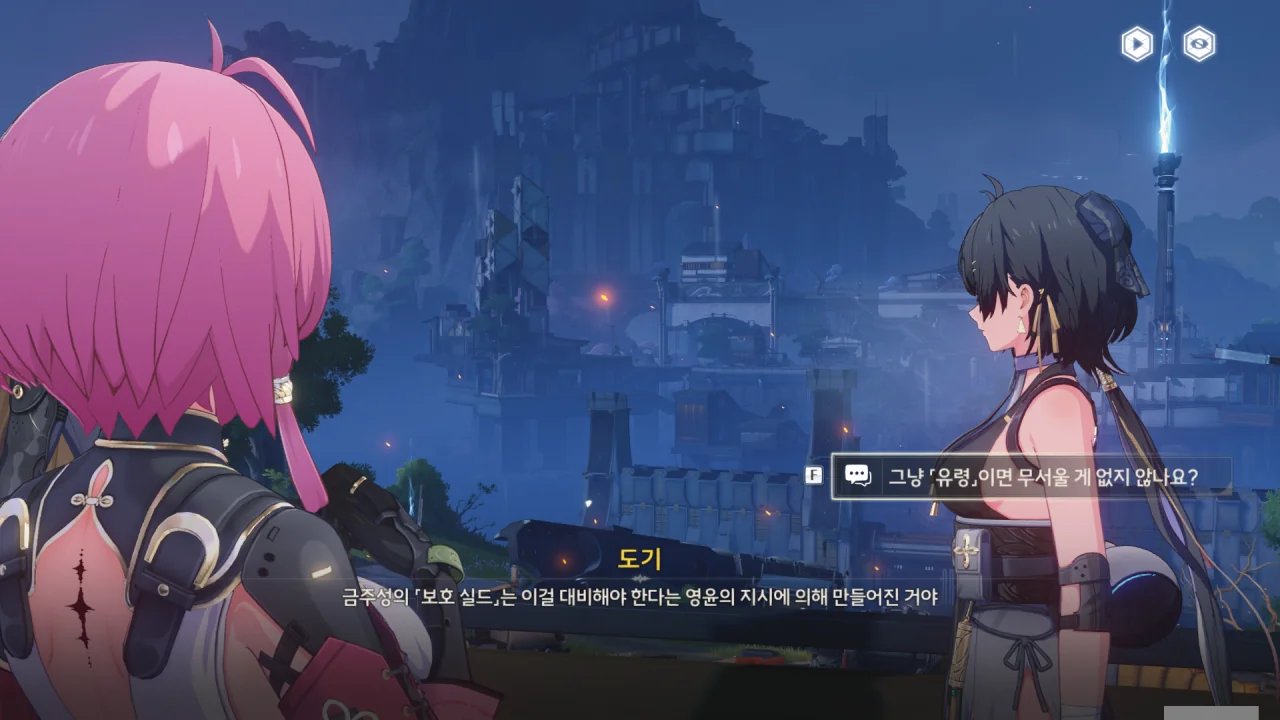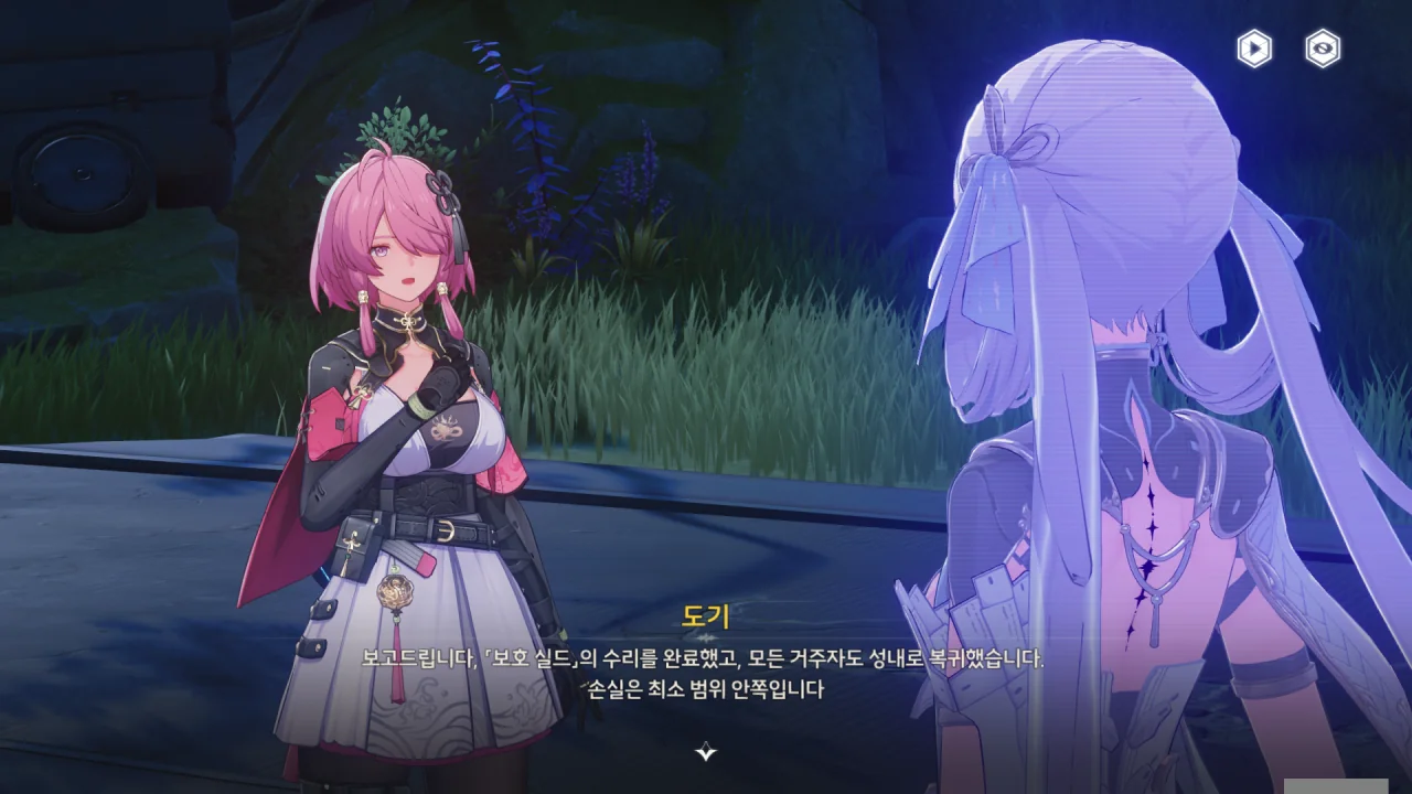 알토가 도기에게 「보호 실드」의 상황을 묻고 있다. 금주성을 보호하던 「보호 실드」가 잔상류의 습격 때문에 한차례 손상을 입은 건지, 도기가 '「보호 실드」를 복구했다'라고 말한다.