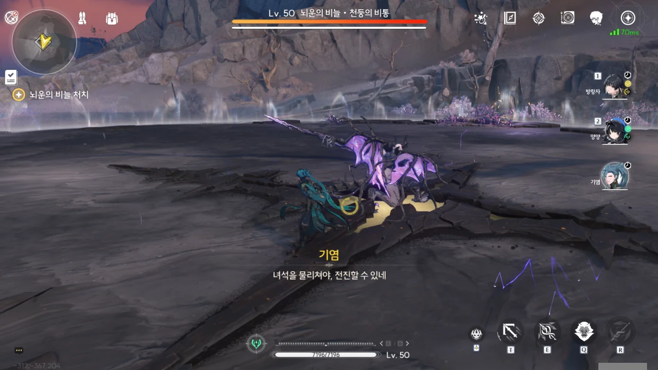 비겁하게 은신했다가 방랑자의 뒤를 치려던 뇌운의 비늘을 기염이 막아준다.