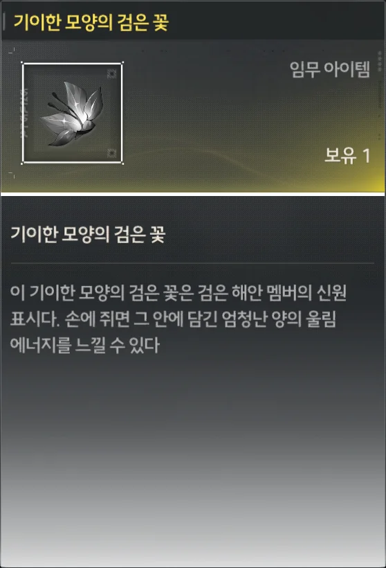 이 기이한 모양의 검은 꽃은 검은 해안 멤버의 신원 표시다. 손에 쥐면 그 안에 담긴 엄청난 양의 울림 에너지를 느낄 수 있다.