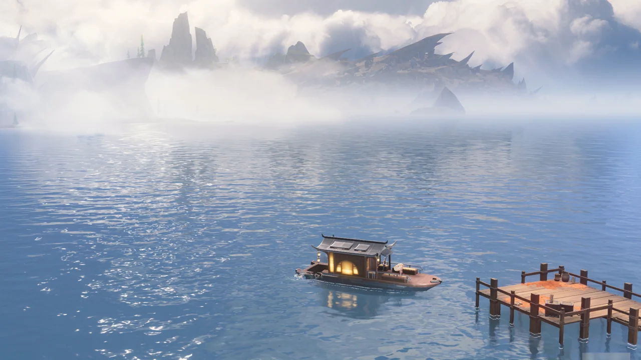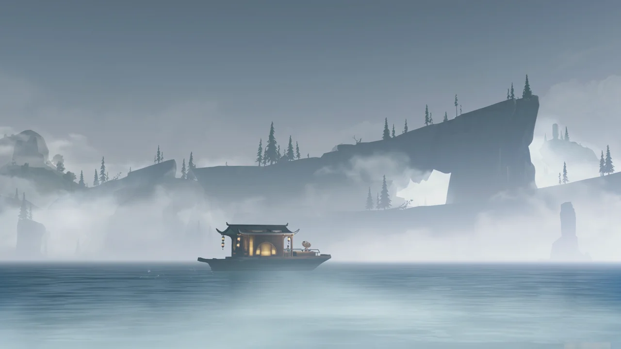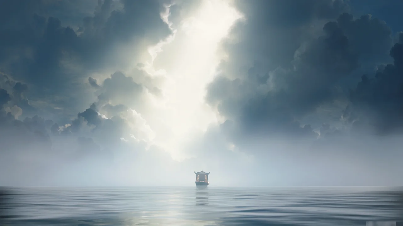 길상 할아버지가 말한 대로, 짙은 바다 안개를 뚫고 배가 승소산으로 나아간다.