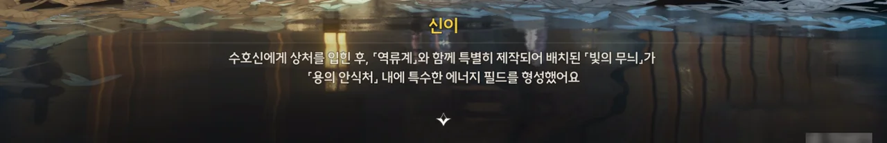 용의 뿔은 본래 '천지와 함께하며 영생을 누리는 일족" — 용의 뿔을 포함한 수호신이 이변이 없는 한 영생한다는 걸 말하는 것으로 보인다 — 이지만, 과거에 치유 불가능한 부상을 입었다. 본래라면 부상이 점차 심해져 죽었겠지만, 「용의 안식처」 덕분에 생명을 유지할 수 있었다. 하지만 앞서 직정 문서에서 보았듯, 용의 안식처는 용의 뿔의 부상의 정도가 심해지는 걸 막는 정도밖에 할 수 없기에, 잔성회의 공격에 의해 부상이 심해진 지금, 용의 뿔의 목숨은 경각에 달하게 되었다.