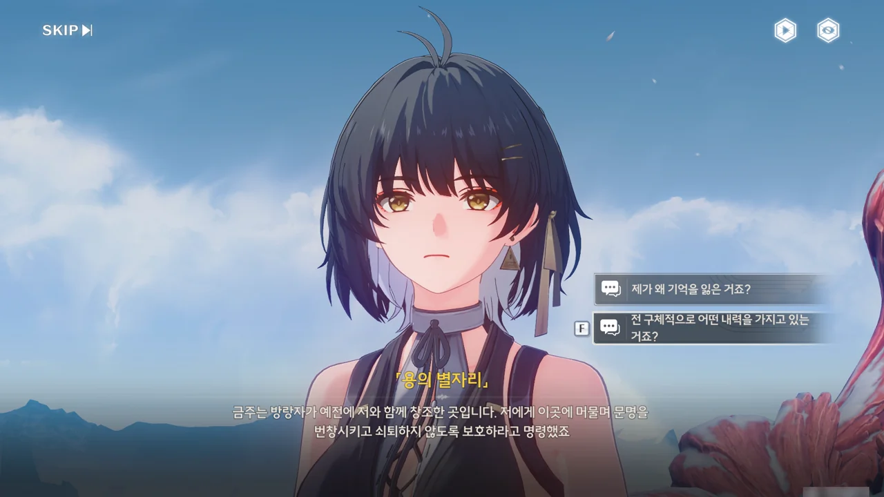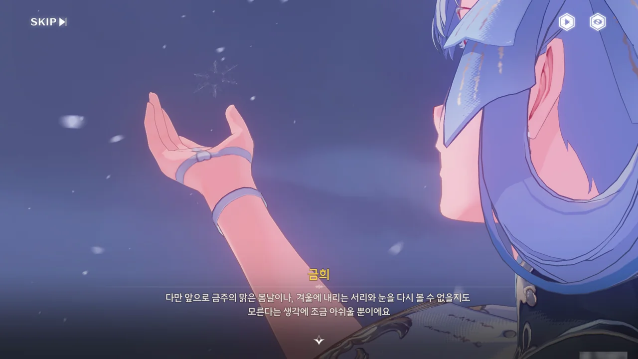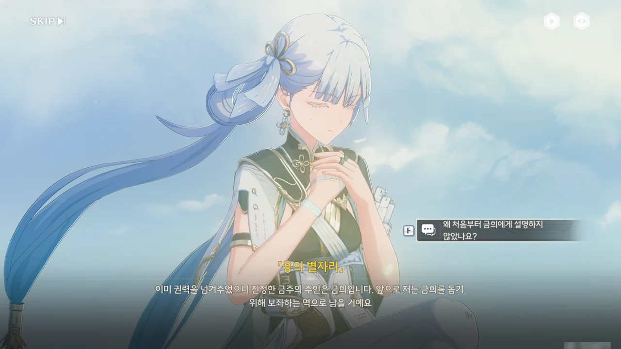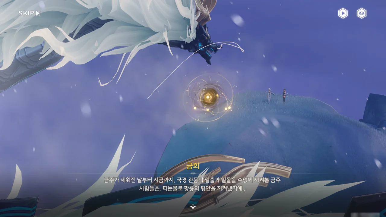 「용의 뿔」이 방랑자에게 시간 제어 능력 양도 여부를 다시금 묻자, 방랑자는 잠시 금희의 모습을 돌아본 후, 오른손을 들어 이를 허가한다.
