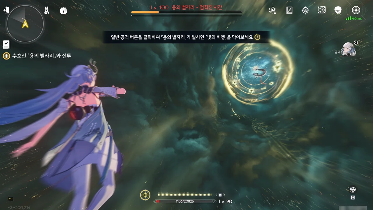 일반 공격 버튼을 클릭하여 「용의 뿔」이 발사한 「빛의 비행」을 막아보세요
