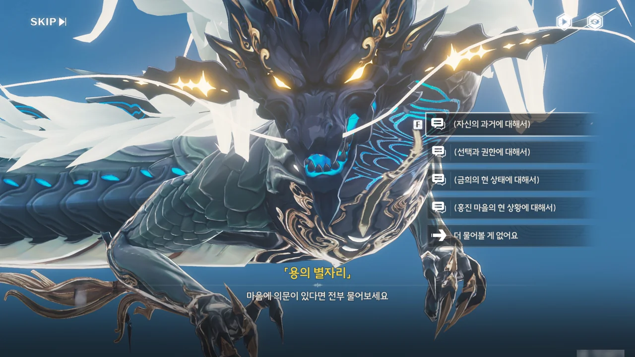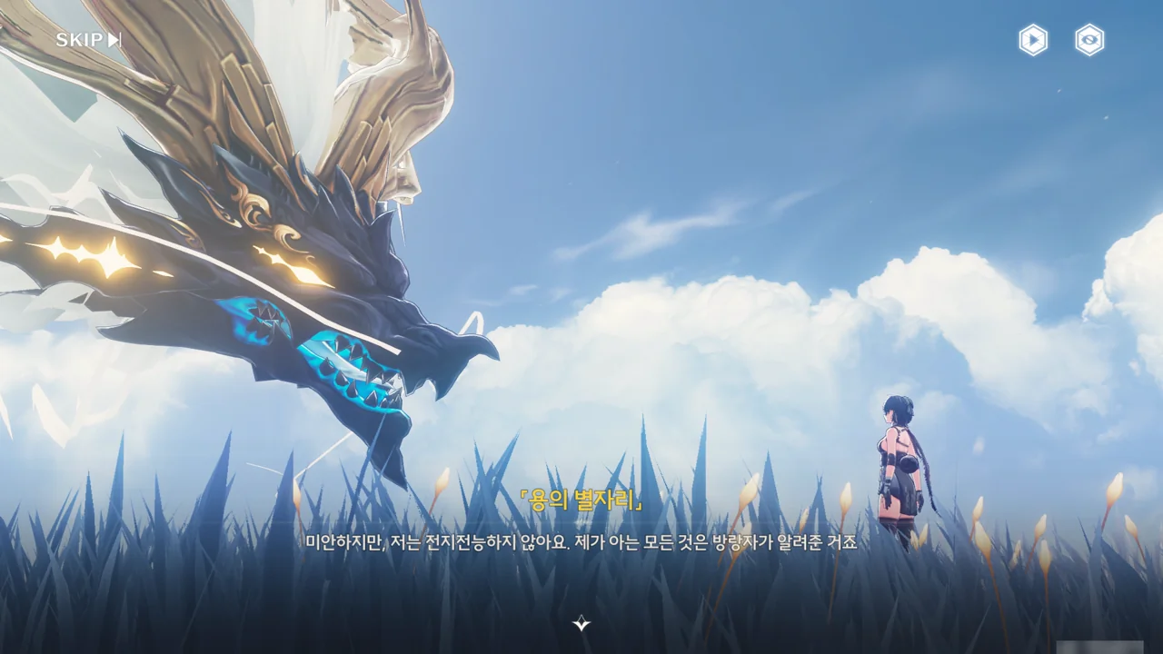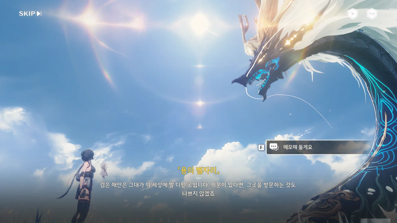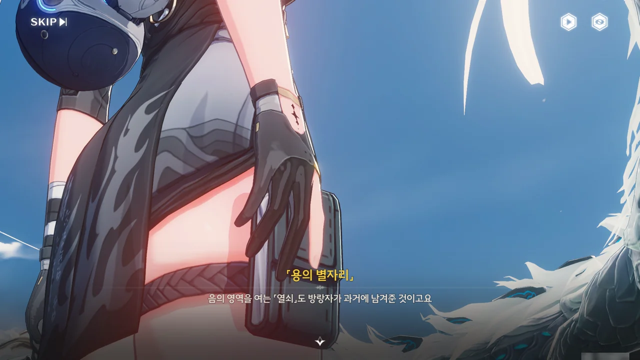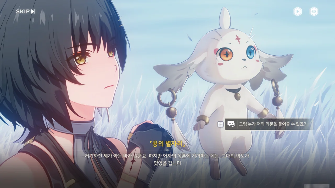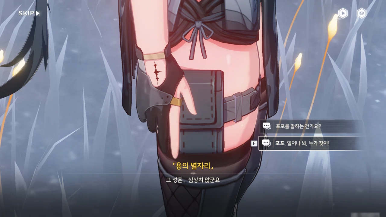 「용의 뿔」은 쪼꼬미가 자신의 숨결 — 아마 본질을 말하는 거겠지? — 과 비슷하면서도 다른 존재라며, 과거 방랑자가 생각한 바가 있기 때문에 쪼꼬미가 지금 방랑자의 성흔 속에 살고 있는 거라고 말해준다.