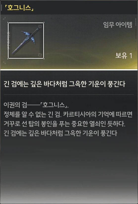 정체를 알 수 없는 긴 검. 카르티시아의 기억에 따르면 거꾸로 선 탑의 봉인을 푸는 중요한 열쇠인 듯하다.