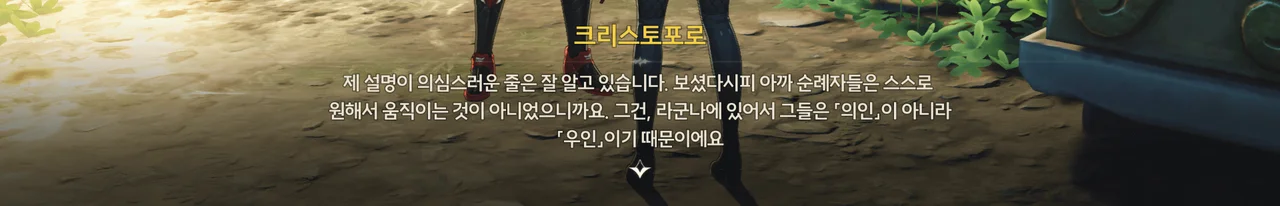 대체 크리스토포로의 정체가 뭘까? 여태껏 나온 잔성회 사람들이 전부 붉은 옷을 입고 있었던 탓에, 크리스토포로도 잔성회가 아닐까 하는 의심이 든다.