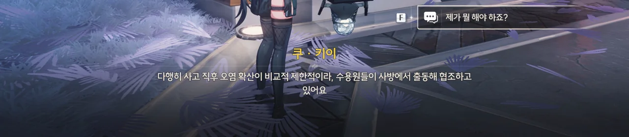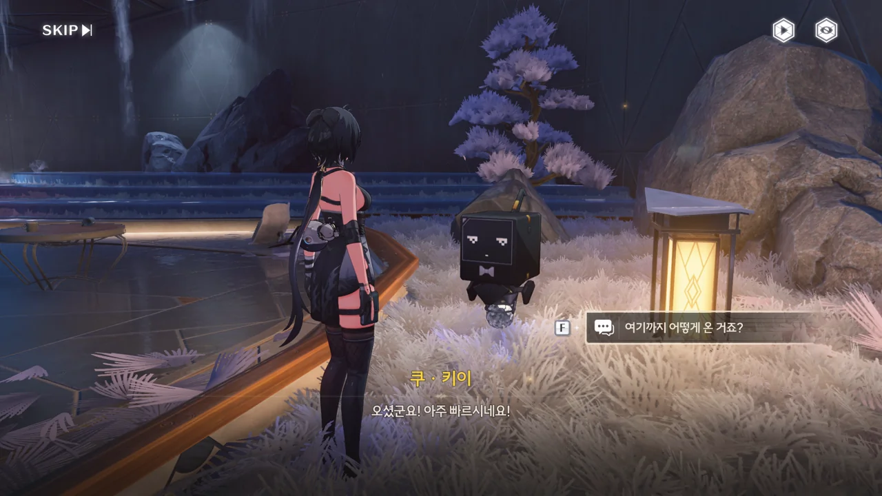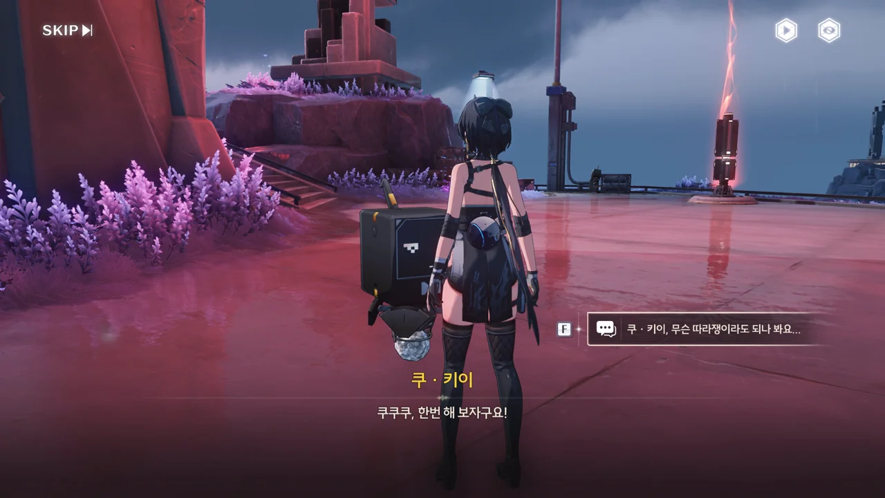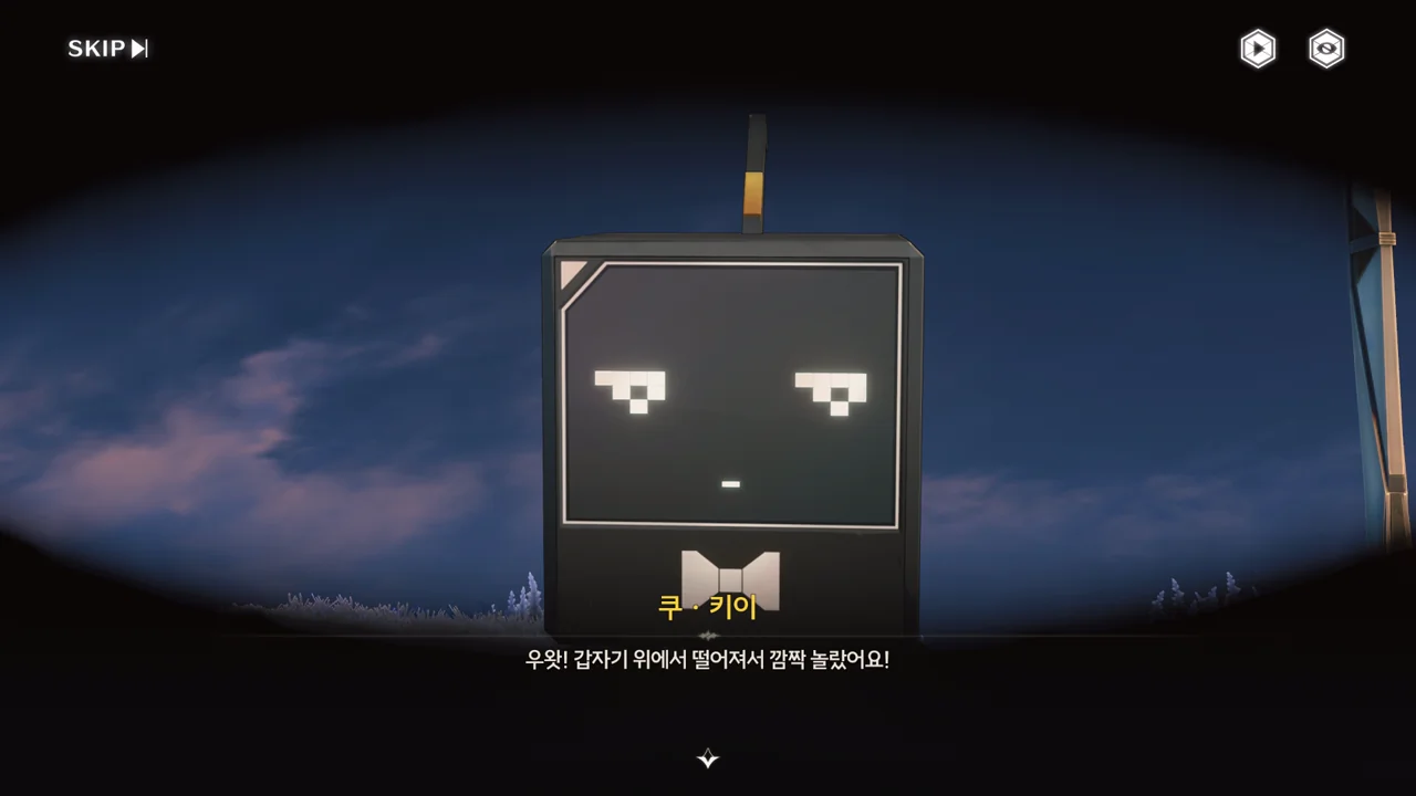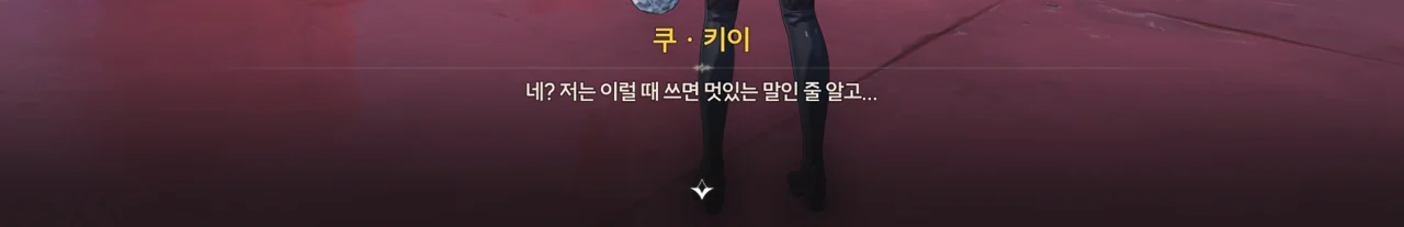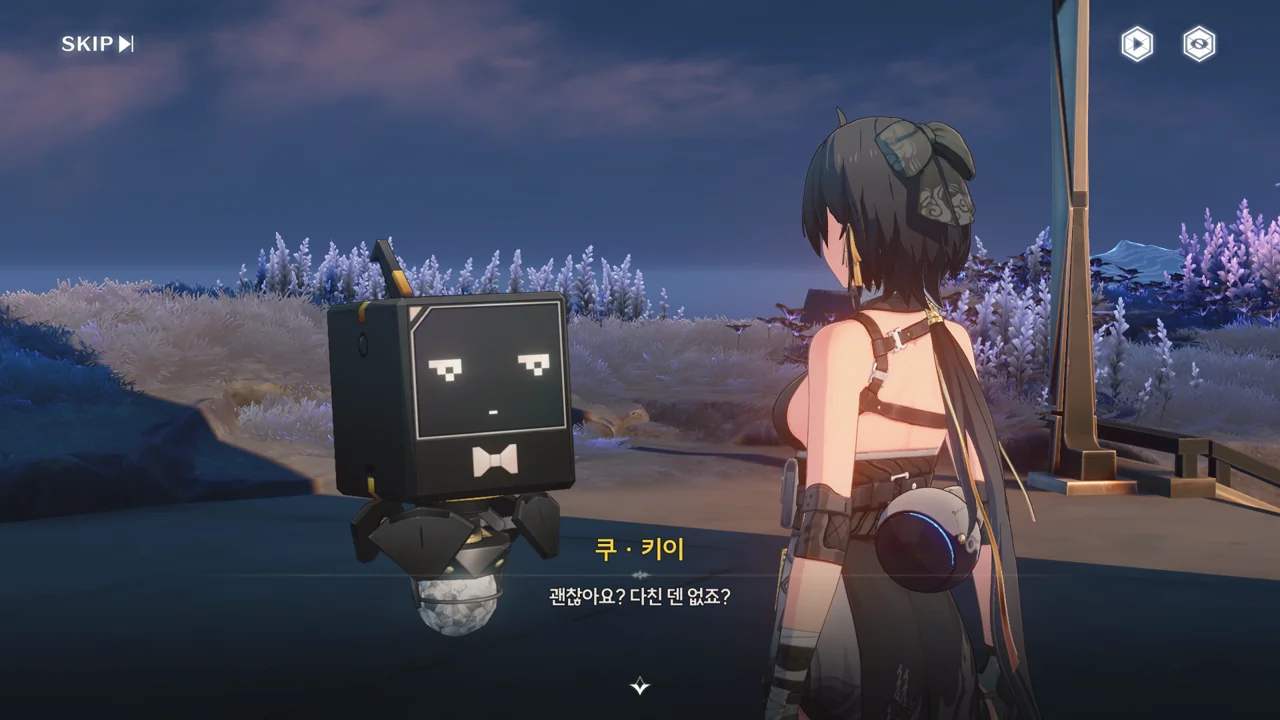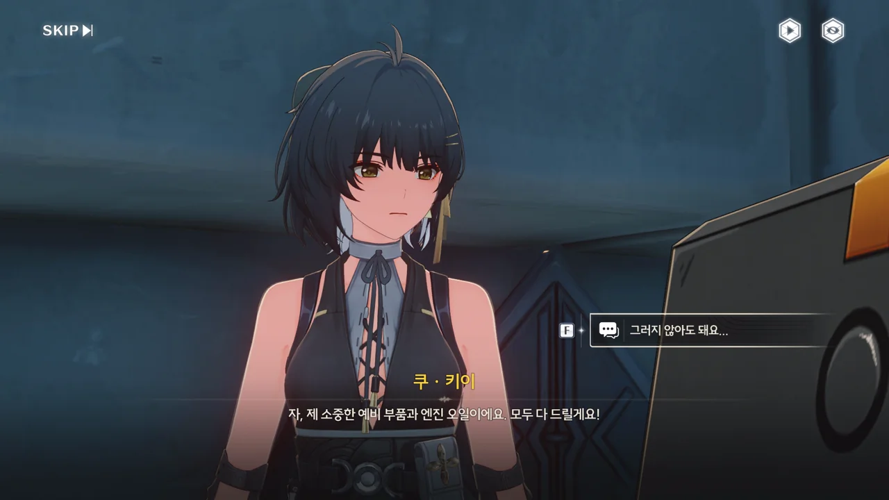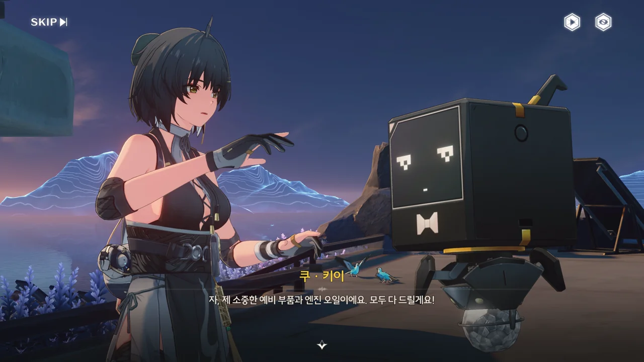 방랑자가 다친 줄 알고 자신의 수리용 부품과 엔진 오일을 주려는 쿠 키이. 방랑자는 로봇이 아니라 사람이라서 그게 필요 없긴 한데, 마음만은 고맙다.