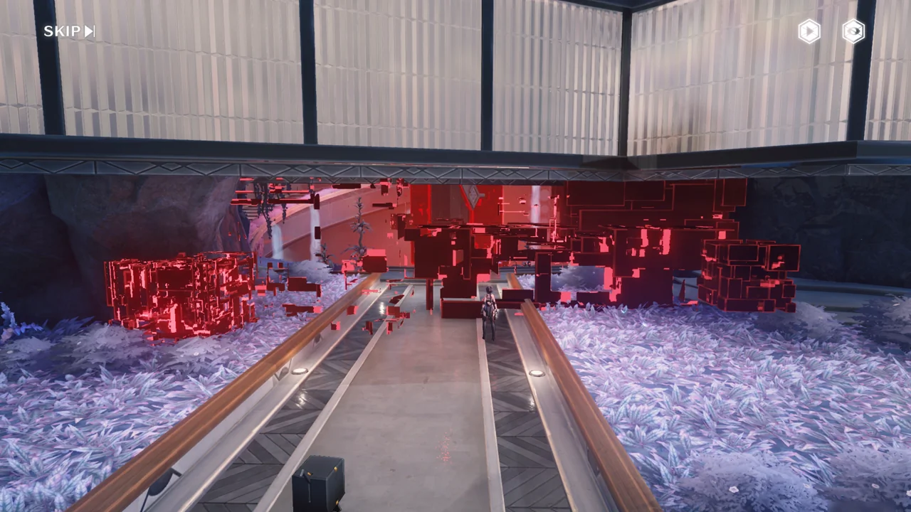 붉은색의 큐브들이 잔뜩 나타나서 길을 틀어막고 있다. 이게 그 이상 주파수가 실체화한 건가?