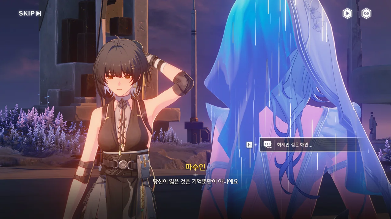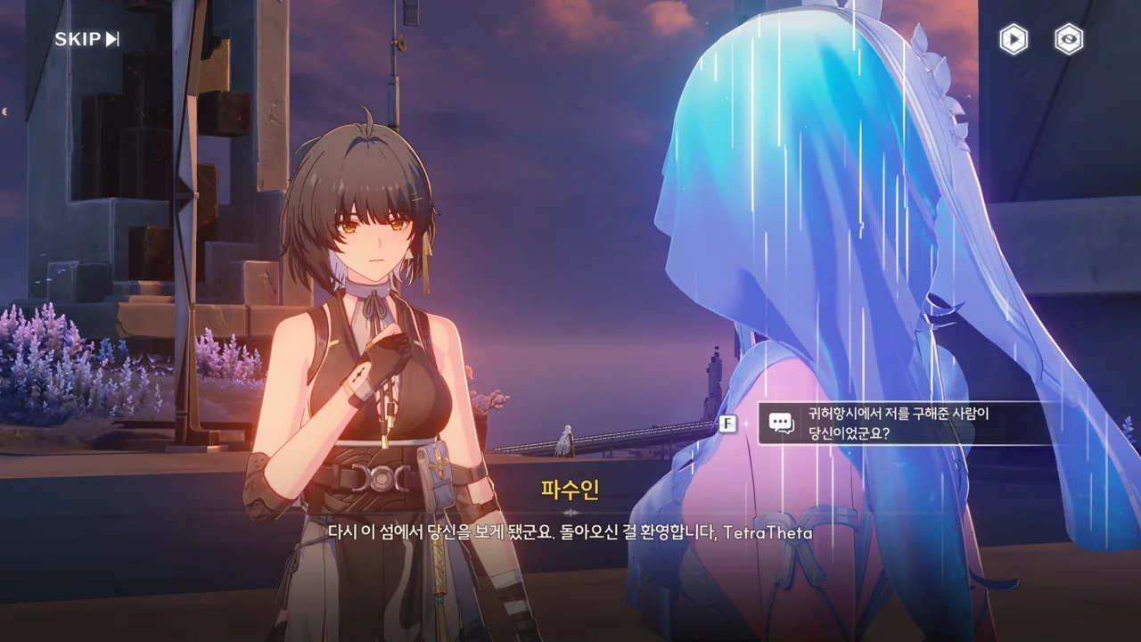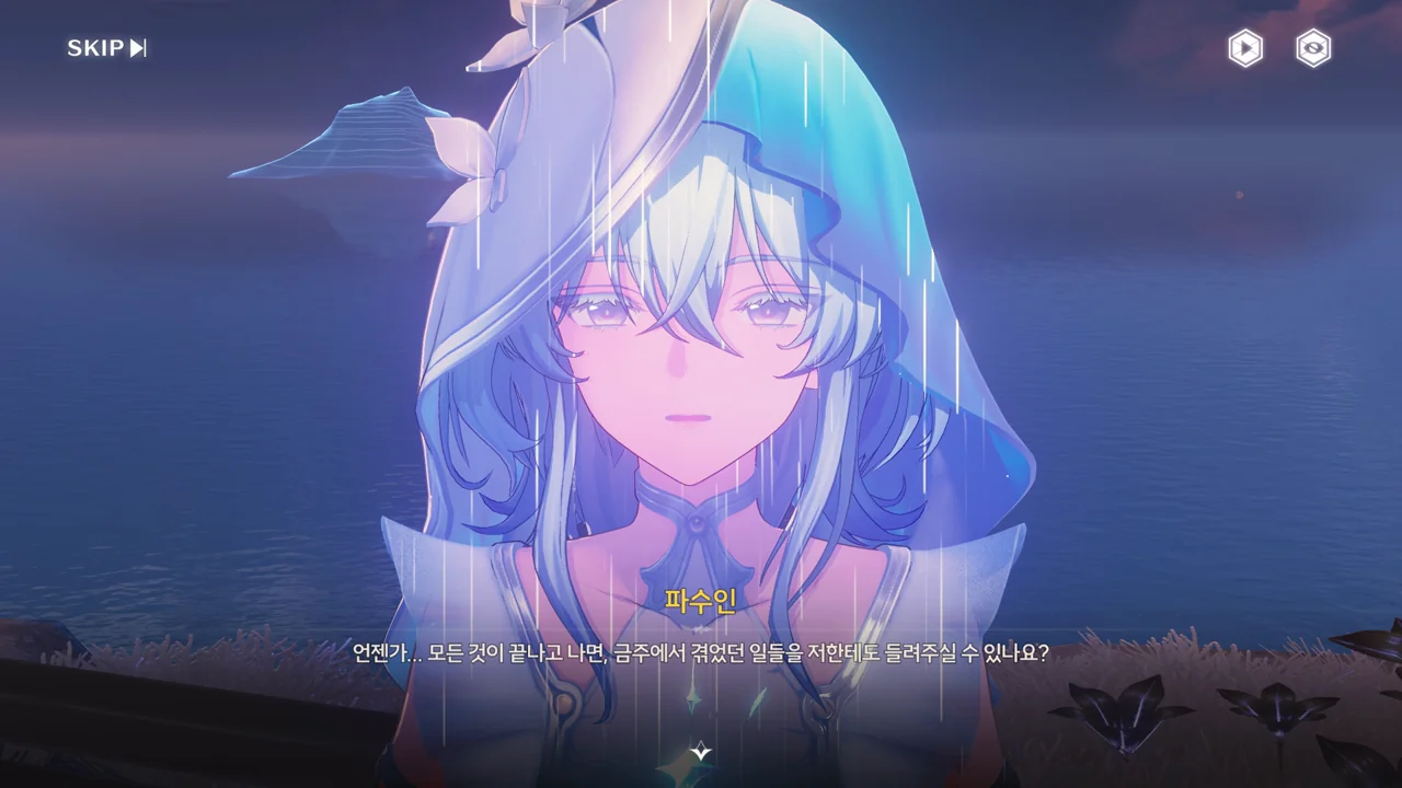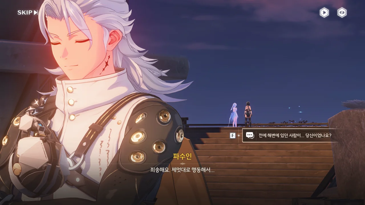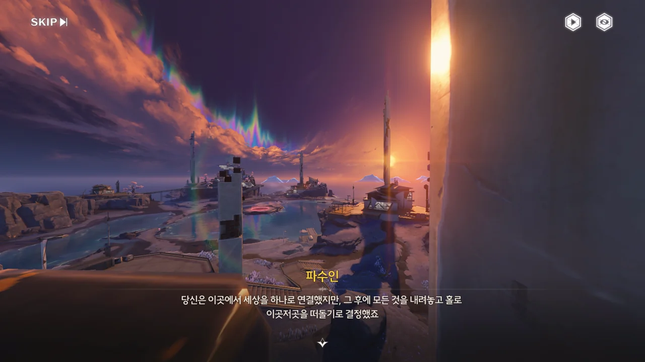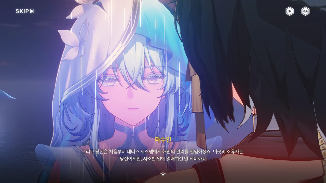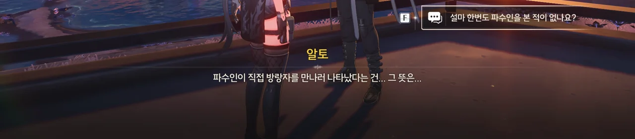 예상했던 대로, 귀허항시에서 방랑자 일행을 구해준 건 파수인이 맞았다. 다만 "제멋대로 행동해서 죄송하다"라고 하는 걸 보면, 원래 해서는 안될 행동이었나 보다. 아마 그 기준은 과거 기억을 잃기 전의 방랑자가 세운 거겠지?