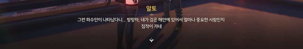 알토 말에 따르면, 파수인이 방랑자 앞에 나타난 것 자체가 방랑자가 검은 해안에 있어 매우 중요한 사람임을 나타낸다고 한다. 정보 상인을 자처하는 알토조차 이번이 파수인을 보는 처음이라고 하지 않는가.