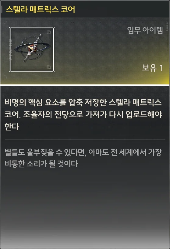 비명의 핵심 요소를 압축 저장한 스텔라 매트릭스 코어. 조율자의 전당으로 가져가 다시 업로드해야 한다.