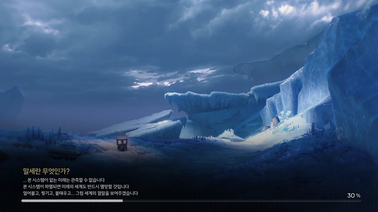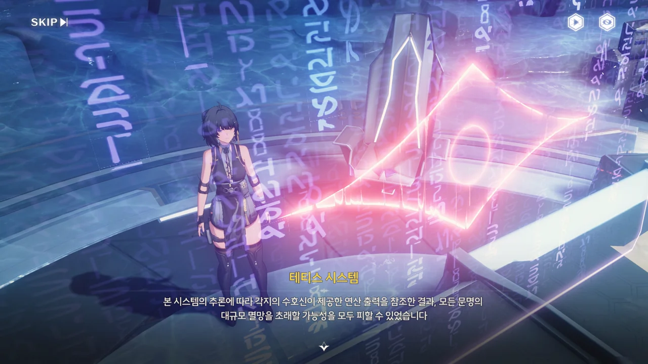 … 본 시스템이 없는 미래는 관측할 수 없습니다. 본 시스템이 파멸되면 미래의 세계도 반드시 멸망할 것입니다. 얼어붙고, 찢기고, 불태우고… 그럼 세계의 결말을 보여주겠습니다.