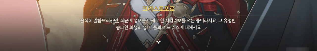크리스토포로는 희생의 성녀, 「플뢰르 드 리스」를 소재로 한 시나리오를 쓰던 중, 성녀의 성격을 묘사하는데 어려움을 겪었다.