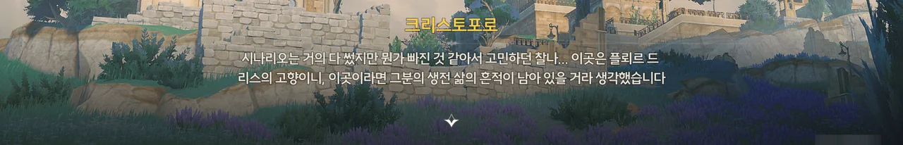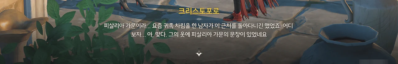 이상 주파수 오염으로 덮인 폐허 꼭대기 위에는 피살리아 가문의 비밀 기호 ― 방랑자가 그걸 대체 어떻게 알아본건지에 대해서는 논외로 하고 ― 가 그러져 있다. 저번에 봤던 피안화는 덤이고.