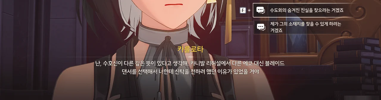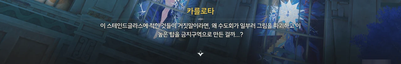 카를로타는 성전이 조작되었으며, 버려진 탑의 스테인드글라스를 통해 숨겨진 진실을 알 수 있을 거라 생각하고 있다.