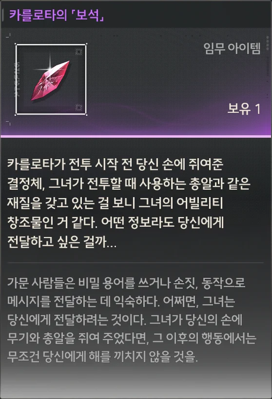 카를로타가 전투 시작 전 당신 손에 쥐여준 결정체. 그녀가 전투할 때 사용하는 총알과 같은 재질을 갖고 있는 걸 보니 그녀의 어빌리티 창조물인 거 같다.