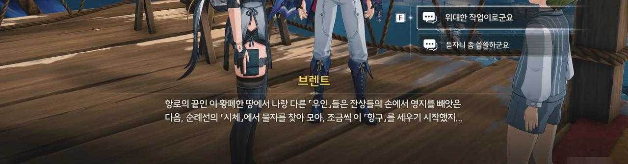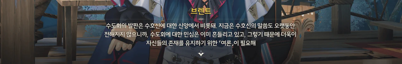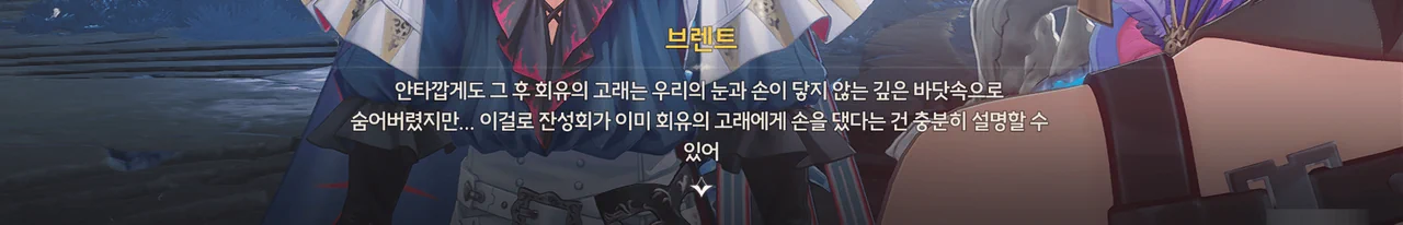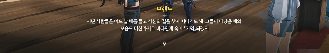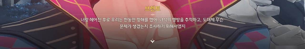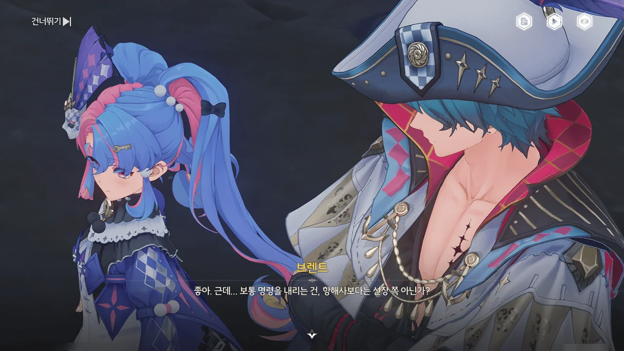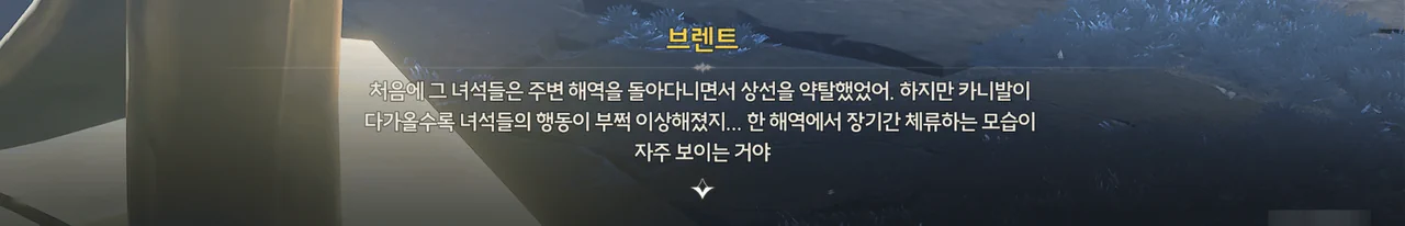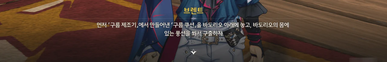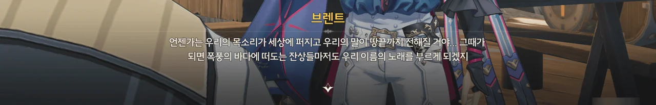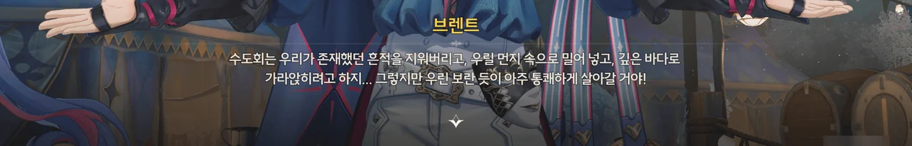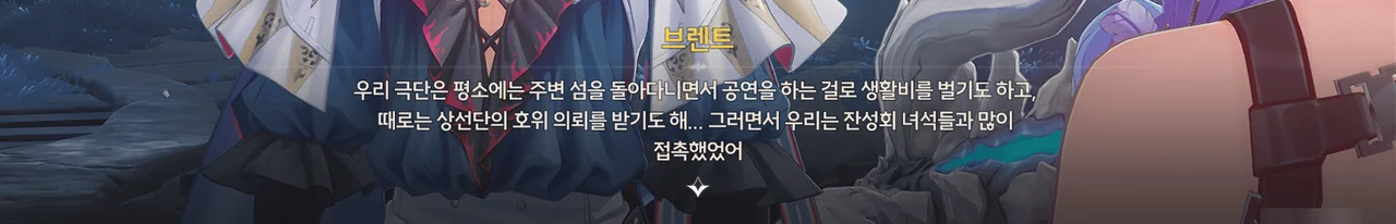 브렌트 보통 명령을 내리는 건, 항해사보다는 선장 쪽 아닌가? 로코코 불만이 있다면 브렌트가 술을 숨겨놓은 곳을 극단 멤버들한테 폭로할 거예요. 브렌트 맡겨만 주시죠, 일등 항해사님!
