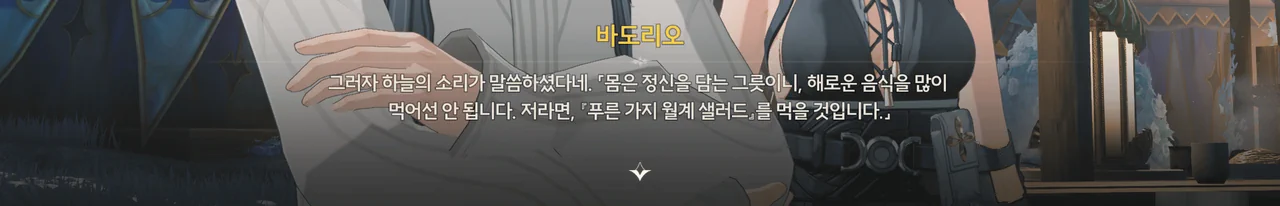 무려 수호신에게 '오늘 저녁 메뉴 추천 좀'을 시전 한 바도리오도 그렇고, 거기에 진지하게 '몸에 좋은 샐러드'라고 답한 임페라토르도 그렇고… 정말 다들 미쳤어…