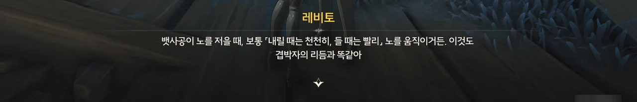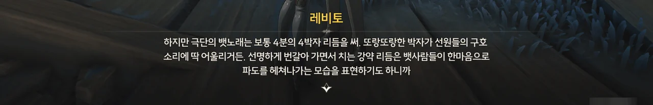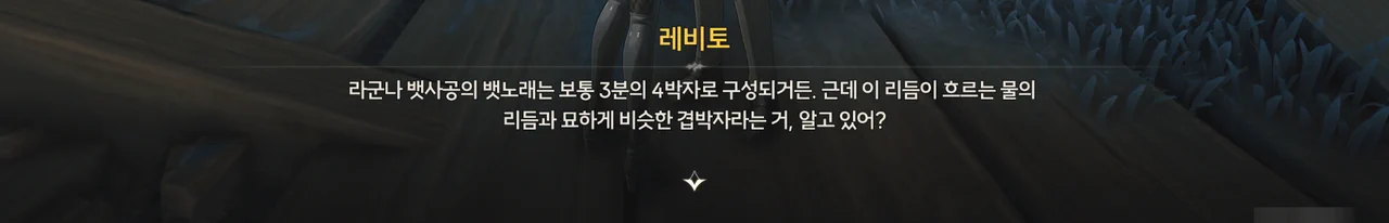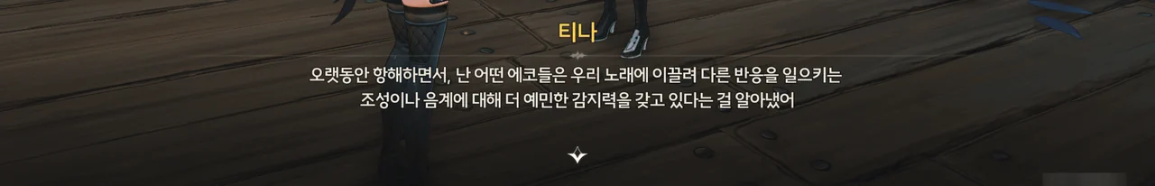 오랜 항해 경험 끝에, 그녀는 어떤 에코들이 특정 조성이나 음계에 대해 더 예민하게 반응한다는 걸 알아내었고, 에코선과 공명하여 더 수월하게 조종하기 위해, 그리고 극단의 노래를 위해 목을 푸는 중이었다.